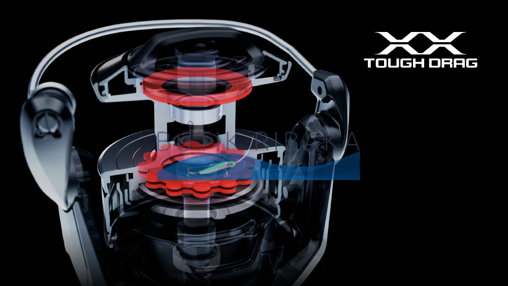 Катушка получила революционный фрикцион XX Tough Drag, разработанный специально для нее. Эксклюзивная конструкция минимизировала потери мощности тормозного усилия сразу на треть по сравнению с предыдущей моделью. Кроме того, на четверть увеличился диаметр переключателя, что расширило возможности тонкой настройки и повысило комфорт работы при вываживании крупных трофеев.
